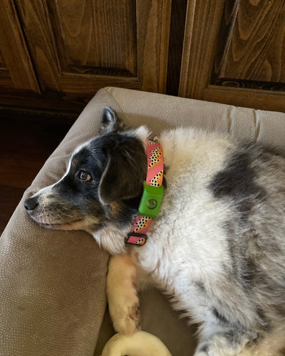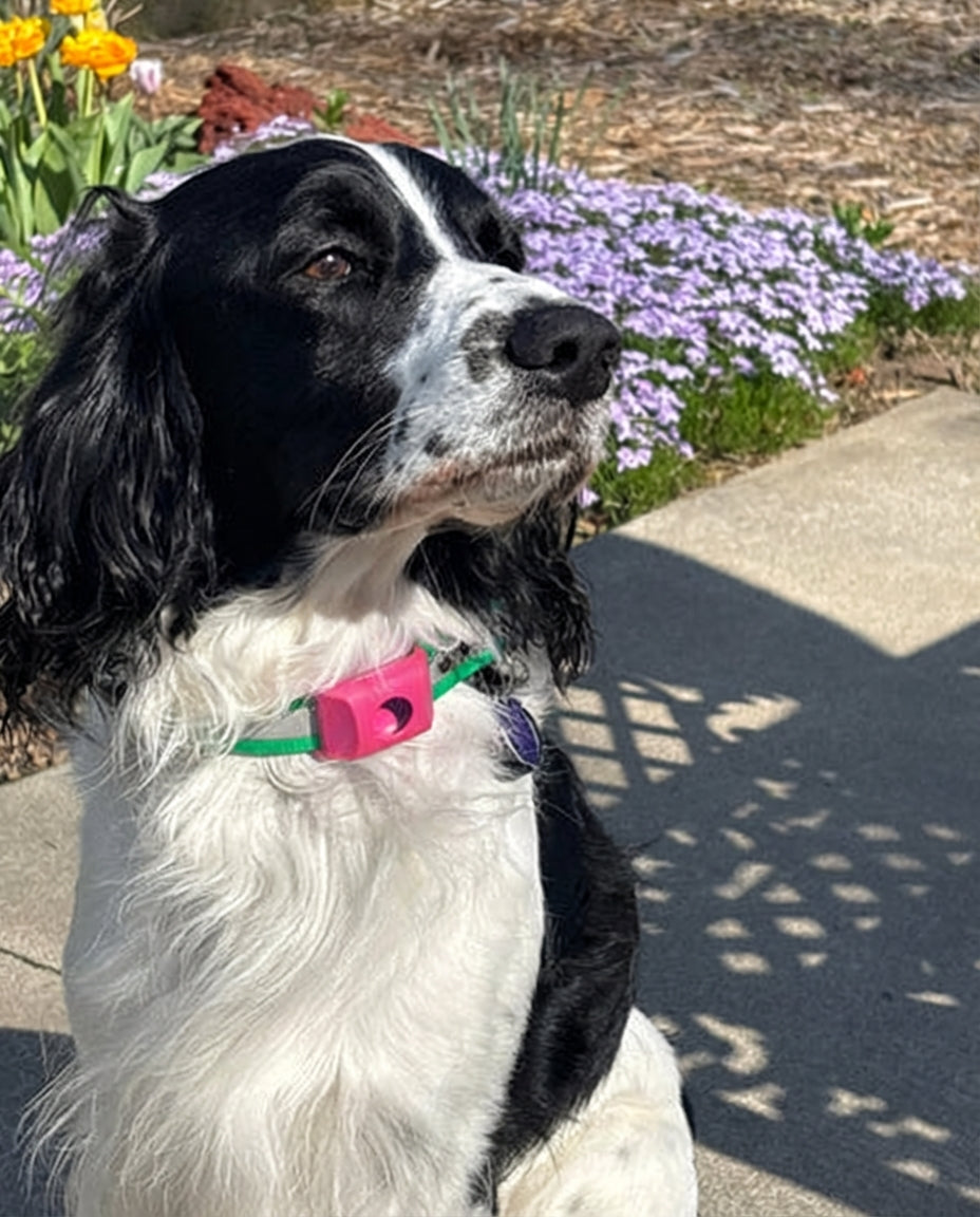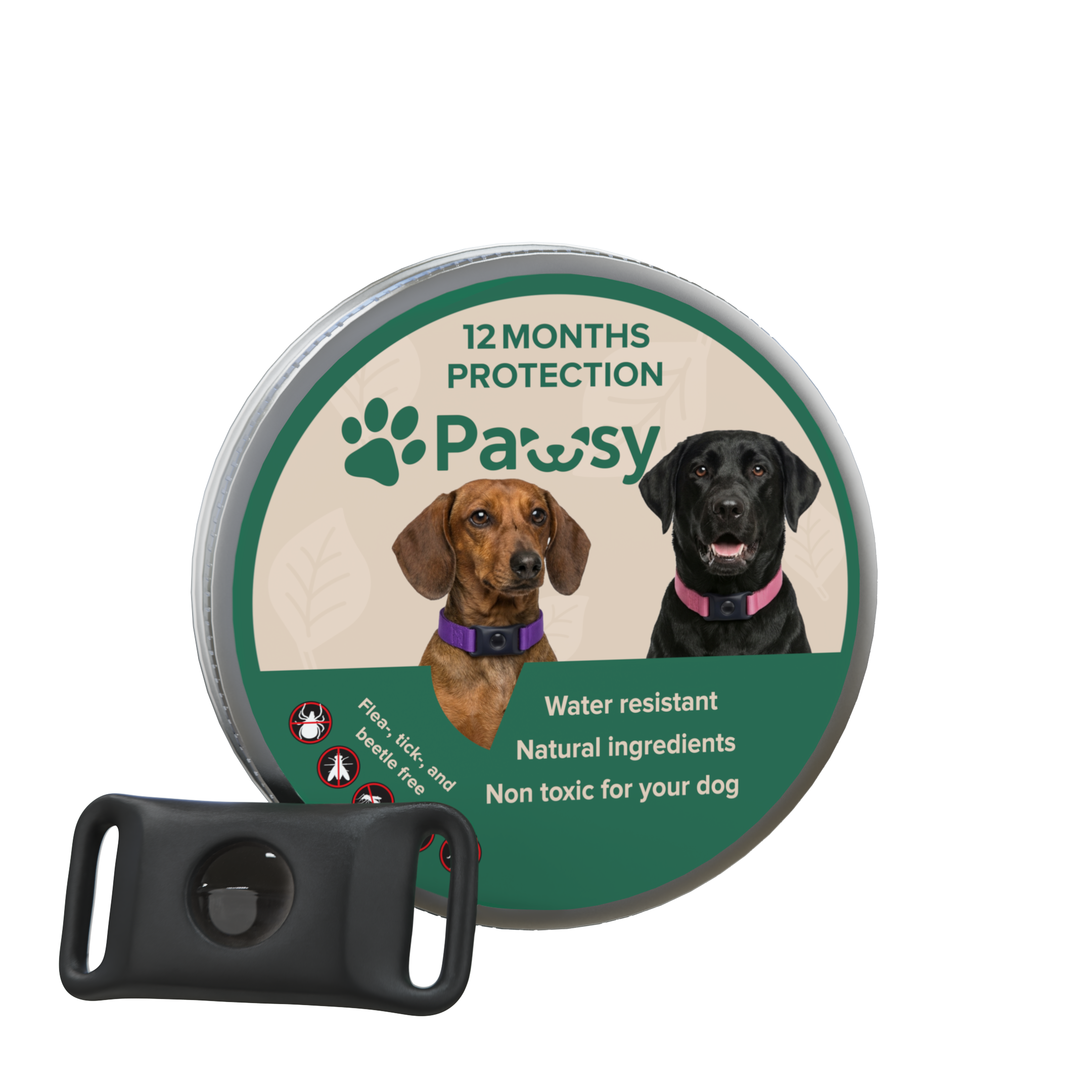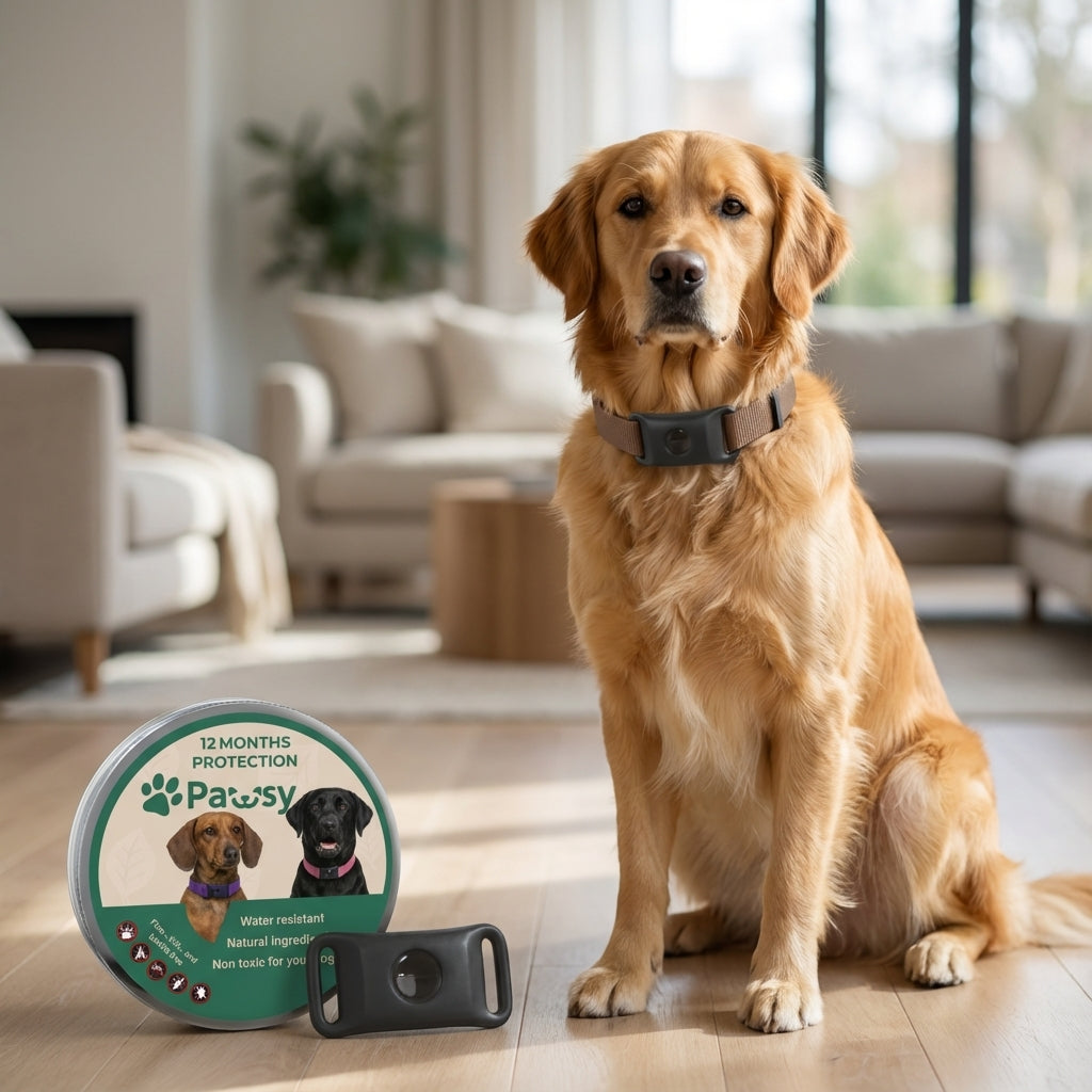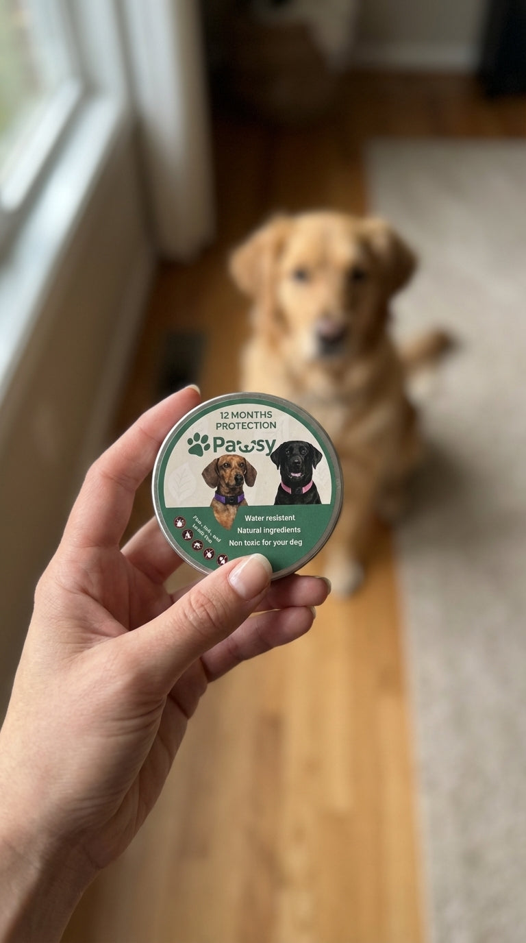 The Pawsy flea & tick collar slowly releases plant-based active ingredients that spread over your pet's coat and skin oils, creating an invisible protective shield. This barrier helps keep fleas, ticks and mosquitoes away all day long, without messy monthly drops or tablets.