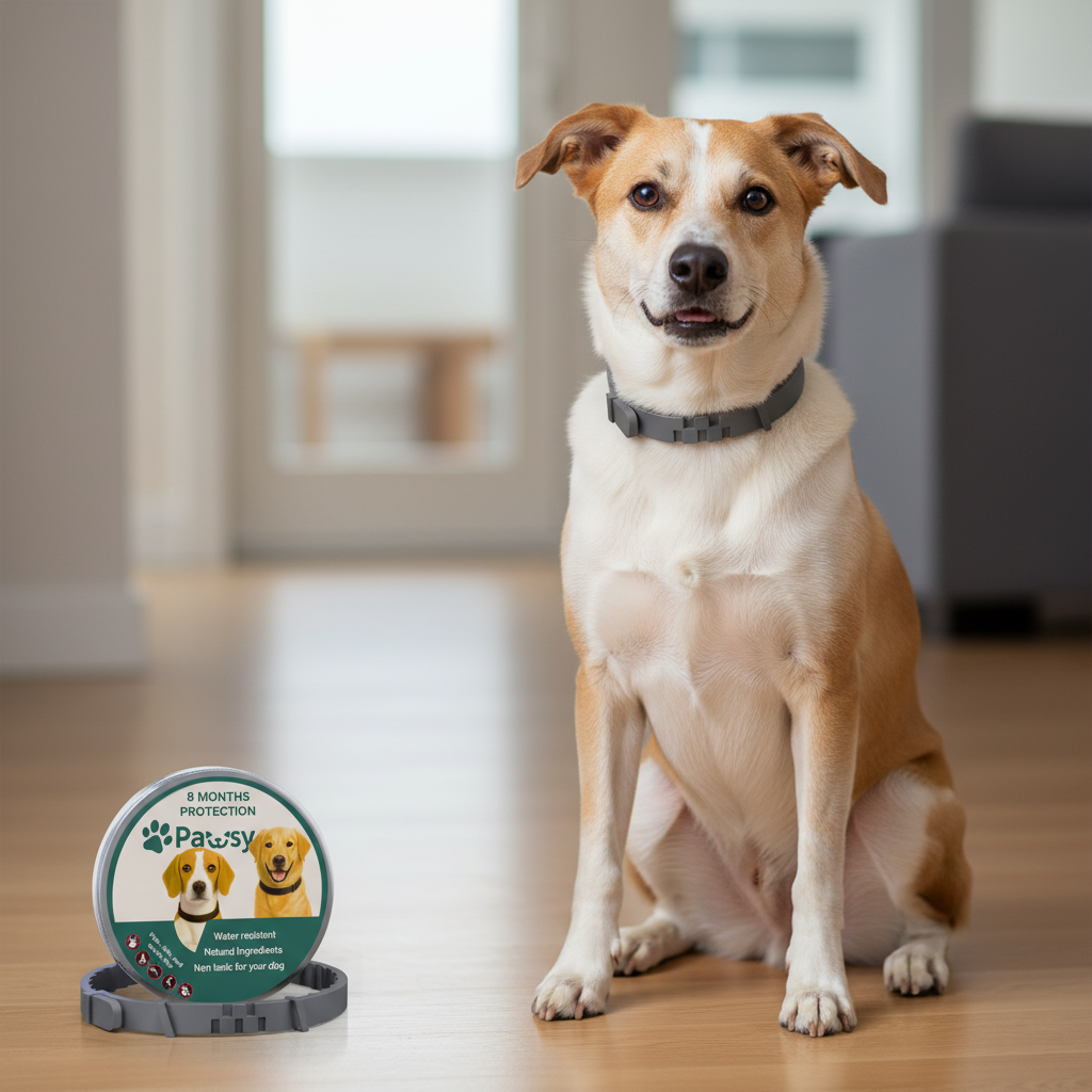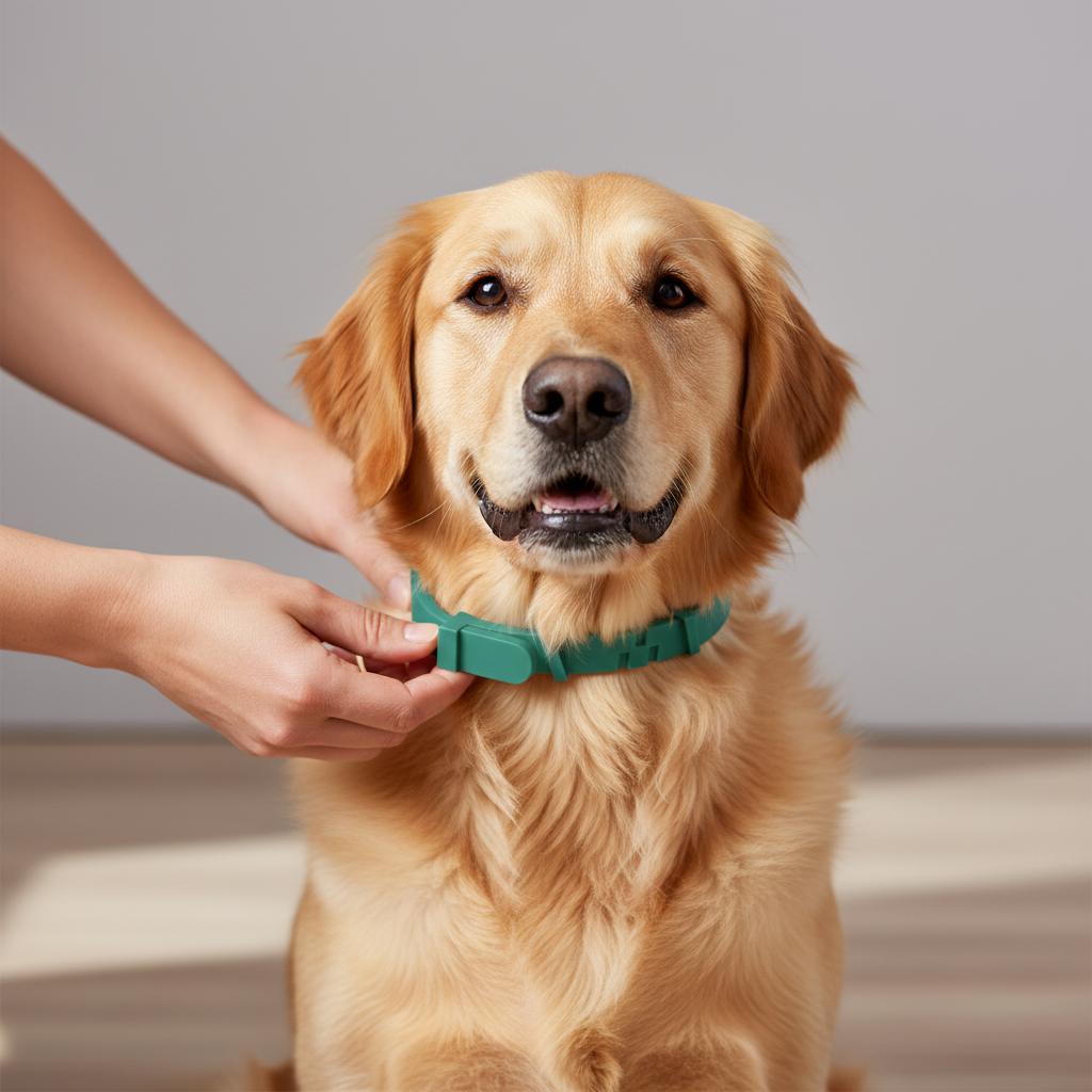Step 1: Remove & Place Take the Pawsy collar out of its protective packaging. Place the collar comfortably around your dog's neck, ensuring it sits flat against the fur.