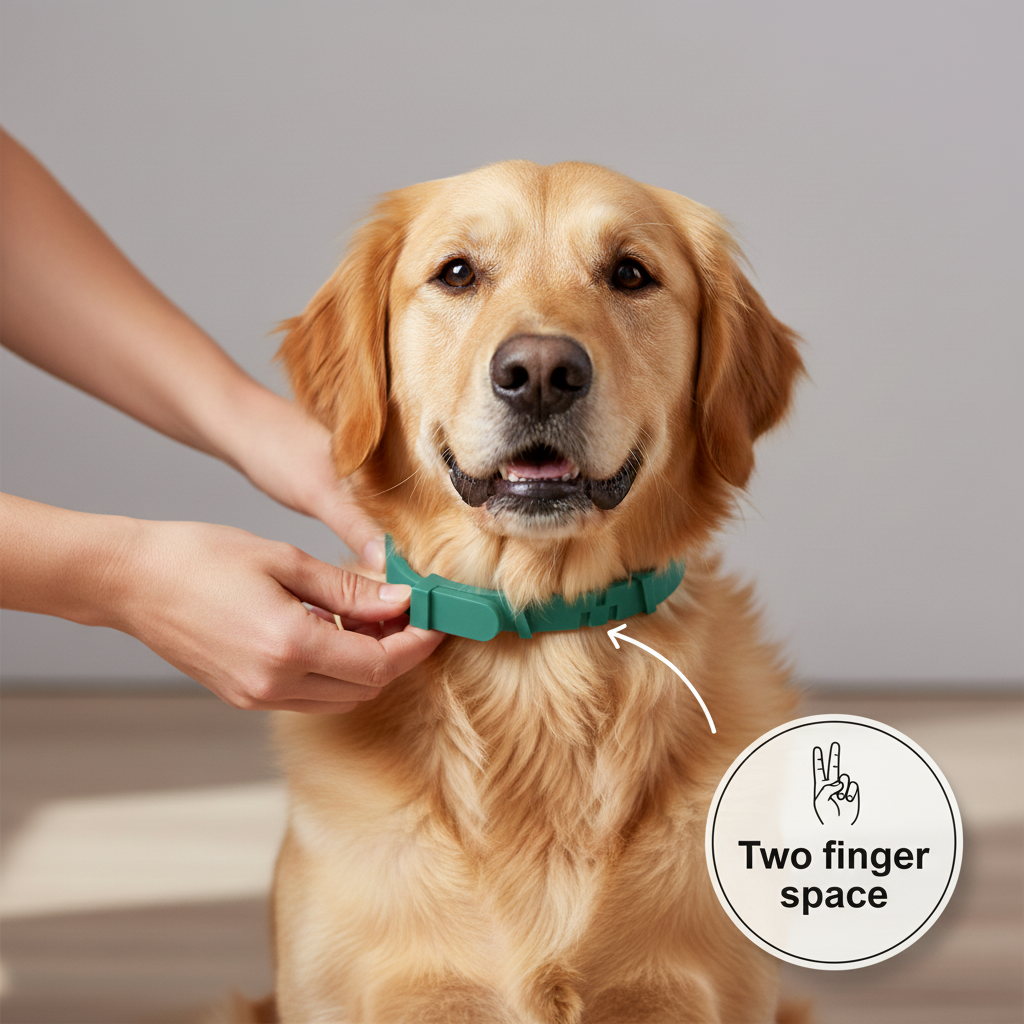 Step 2: Adjust for Perfect Fit Leave space for two fingers between the collar and your dog's neck. This ensures comfort while maintaining effective protection. The collar should fit snugly but not too tight.